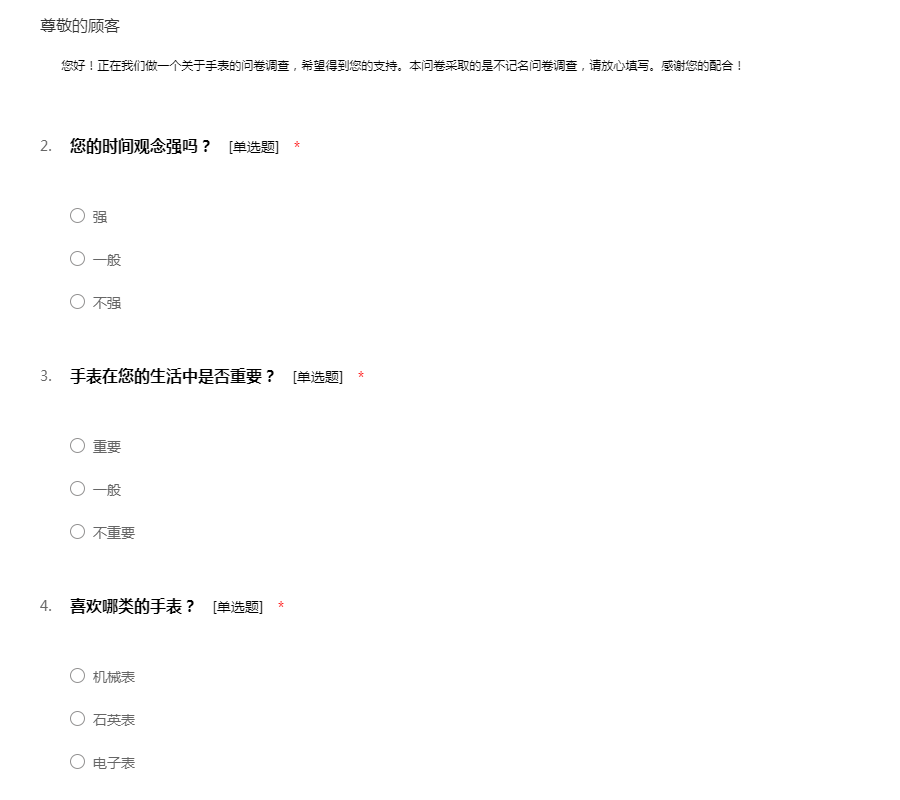 您好!正在我们做一个关于手表的问卷调查,希望得到您的支持。本问卷采取的是不记名问卷调查,请放心填写。感谢您的配合!