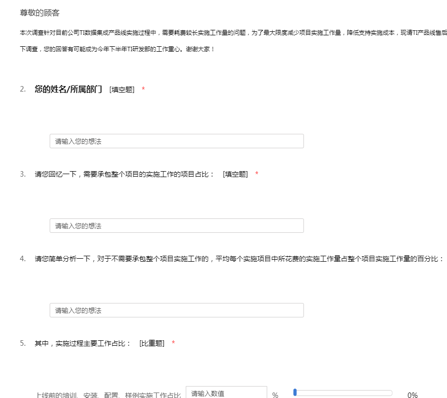 本次调查针对目前公司TI数据集成产品线实施过程中,需要耗费较长实施工作量的问题,为了最大限度减少项目实施工作量,降低支持实施成本,现请TI产品线售后工程师拨冗抽几分钟,根据我们设计的问题做一下调查,您的回答有可能成为今年下半年TI研发部的工作重心。谢谢大家!