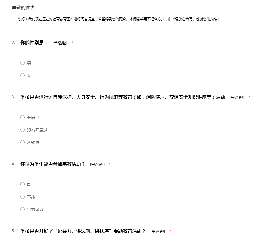 您好!我们现在正在对德育教育工作进行问卷调查,希望得到您的配合。本问卷采用不记名方式,所以请放心填写。感谢您的支持!