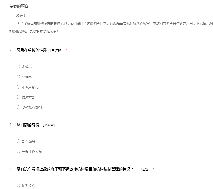 您好! 为了了解当前机构设置的具体情况,我们设计了这份调查问卷。请您结合实际情况认真填写,本次问卷调查只作研究之用,不记名。您的宝贵建议将对机构设置和编制工作产生积极的影响。衷心感谢您的支持!