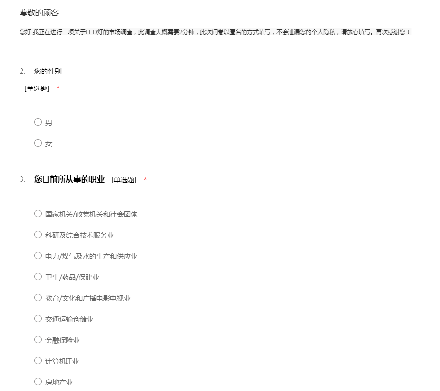 您好,我正在进行一项关于LED灯的市场调查,此调查大概需要2分钟,此次问卷以匿名的方式填写,不会泄漏您的个人隐私,请放心填写。再次感谢您!