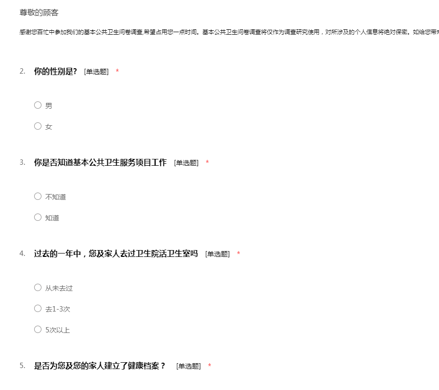 感谢您百忙中参加我们的基本公共卫生问卷调查,希望占用您一点时间。基本公共卫生问卷调查将仅作为调查研究使用,对所涉及的个人信息将绝对保密。如给您带来不便,请见谅。非常感谢您的帮助!