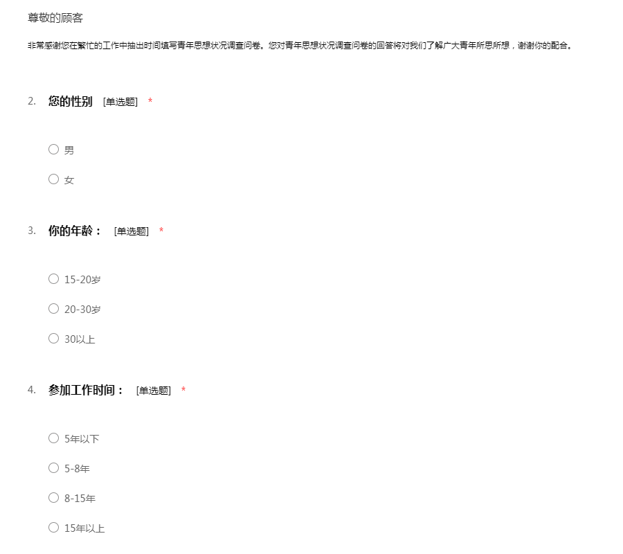 非常感谢您在繁忙的工作中抽出时间填写青年思想状况调查问卷。您对青年思想状况调查问卷的回答将对我们了解广大青年所思所想,谢谢你的配合。