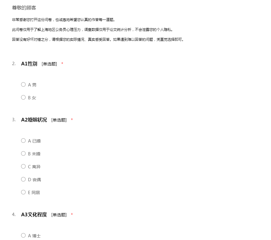 非常感谢您打开这份问卷,也诚恳地希望您认真的作答每一道题。 此问卷仅用于了解上海地区公务员心理压力,调查数据仅用于论文统计分析,不会泄露您的个人隐私。 回答没有好坏对错之分,请根据您的实际情况、真实感受回答。如果遇到难以回答的问题,凭直觉选择即可。