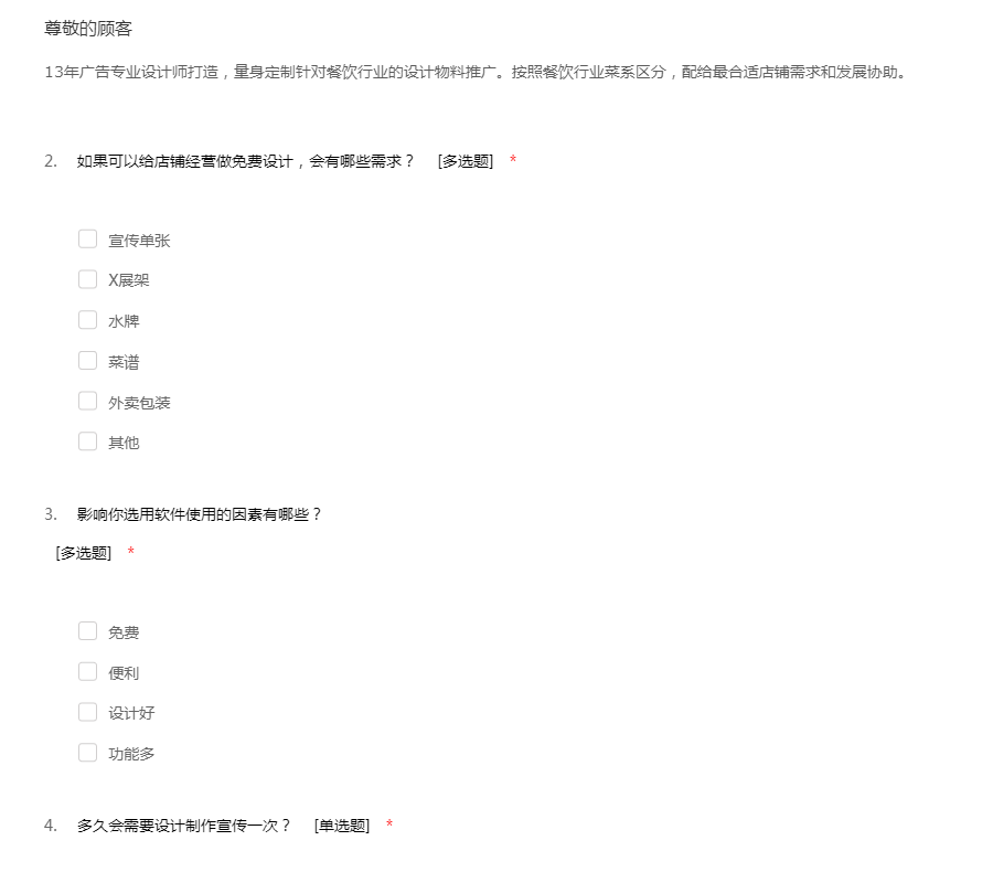 感谢您参与“餐饮市场调查问卷”,本次调查是为了了解顾客对餐饮行业的需求,调查所得的结果对您的工作和生活不会带来任何不良影响,请您根据自己的实际情况放心填写,51调查网感谢您的配合!