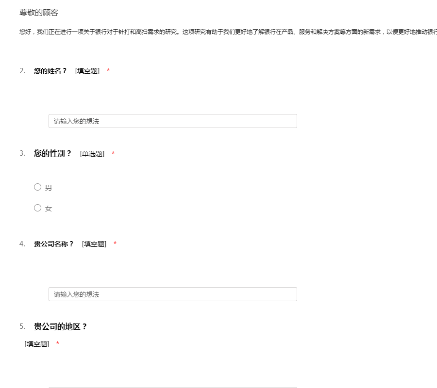 您好,我们正在进行一项关于银行对于针打和高扫需求的研究。这项研究有助于我们更好地了解银行在产品、服务和解决方案等方面的新需求,以便更好地推动银行业发展。谢谢您的支持和配合!