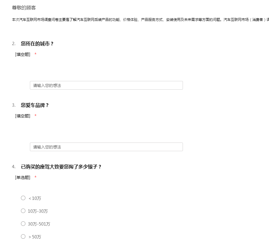 本次汽车互联网市场调查问卷主要是为了解汽车互联网后装产品的功能,价格体验,产品服务方式,安装使用及未来需求等方面的问题.
