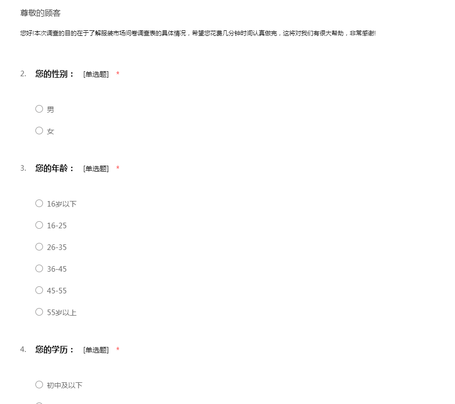 您好!本次调查的目的在于了解服装市场问卷调查表的具体情况,希望您花费几分钟时间认真做完,这将对我们有很大帮助,非常感谢!