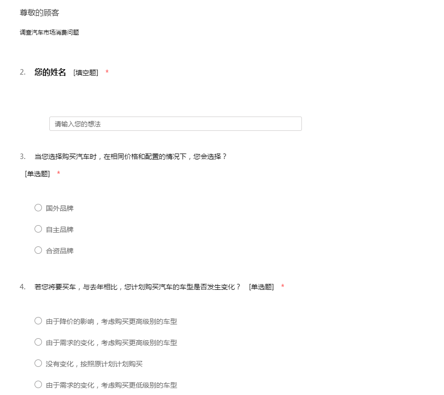 ——您好!汽车已经逐渐走进了寻常百姓家,成为人们所青睐的代步工具之一。我们本次展开了汽车市场问卷调查表,就是为了了解大家对汽车的需求。本问卷采取的是匿名制,所以请放心的把您的真实想法留下。对您的支持我们表示非常感谢!