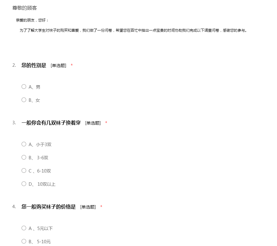 亲爱的朋友,您好: 为了了解大学生对袜子的购买和喜爱,我们做了一份问卷,希望您在百忙中抽出一点宝贵的时间协助我们完成以下调查问卷,感谢您的参与。