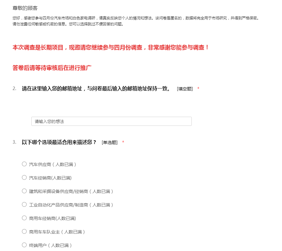 您好,感谢您参与四月份汽车市场和白色家电调研,请真实反映您个人的情况和想法。该问卷是匿名的,数据将完全用于市场研究,并得到严格保密。 请勿泄露任何敏感或机密的信息。您可以选择跳过不便回答的问题。
