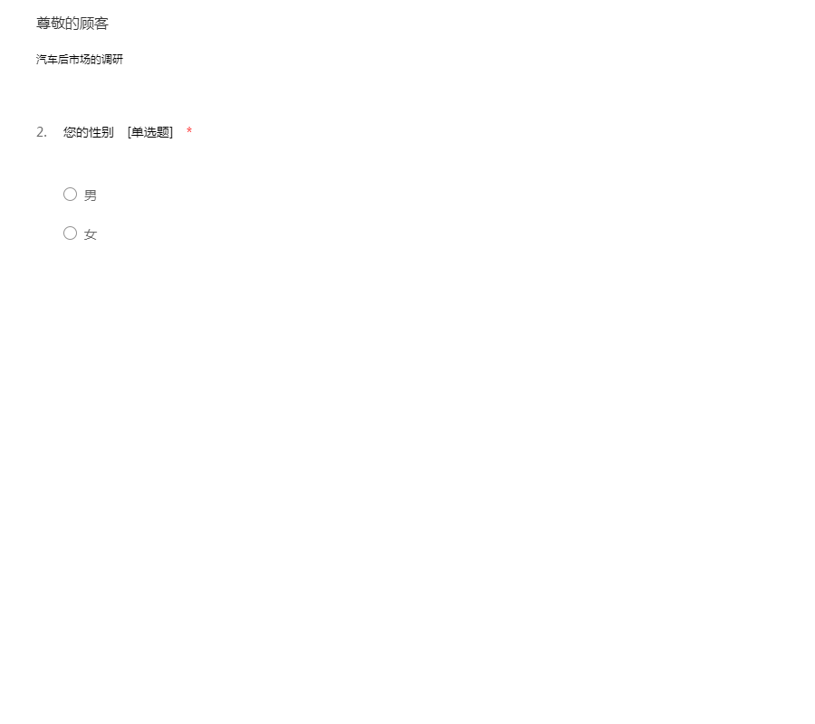 您好,我们在进行一项关于汽车市场的调查,您的信息对于我们非常重要,大概会花费您几分钟的宝贵时间,您提供的信息仅用于统计上的研究分析,而不会提供任何第三方,希望得到您的支持与帮助。谢谢!