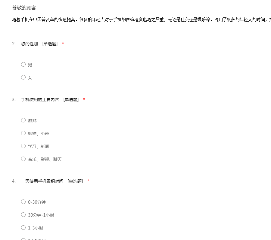 您好!为了更好的了解手机消费的需求我们特地展开了此次手机使用习惯调查活动。希望您在百忙之中抽出一点宝贵的时间协助我们完成以下这份调查问卷。谢谢您的合作!