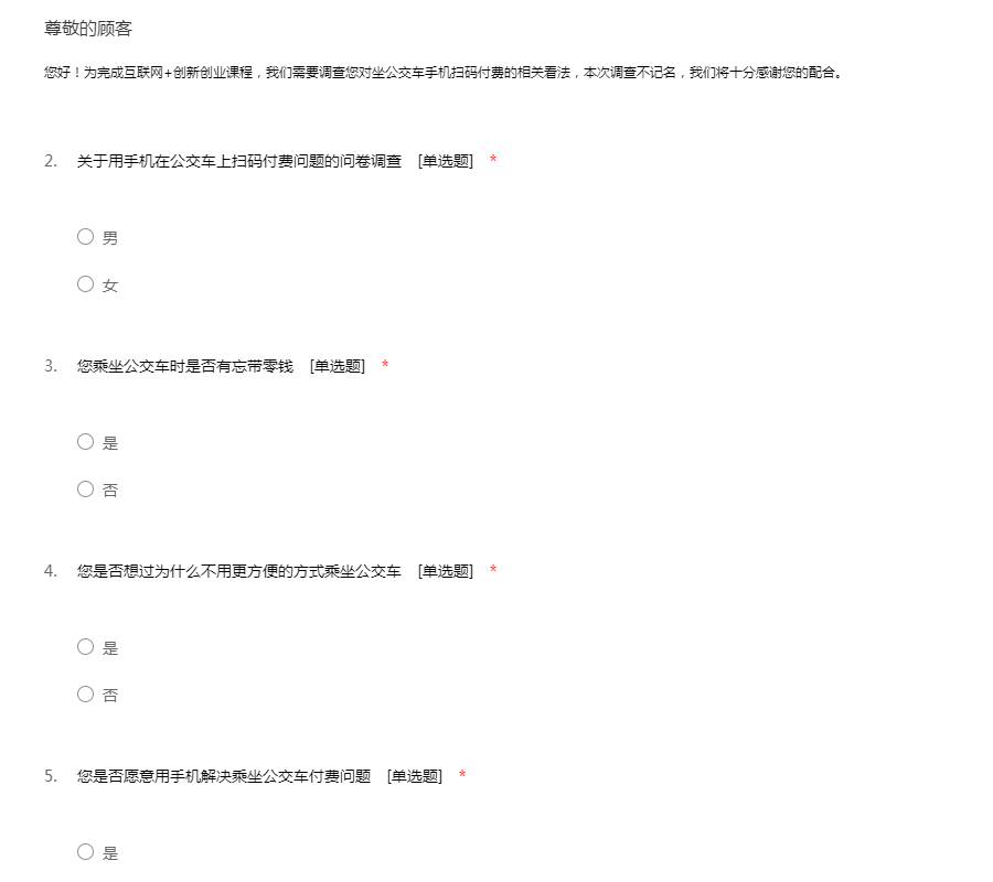 您好!为完成互联网+创新创业课程,我们需要调查您对坐公交车手机扫码付费的相关看法,本次调查不记名,我们将十分感谢您的配合。