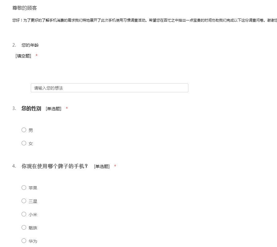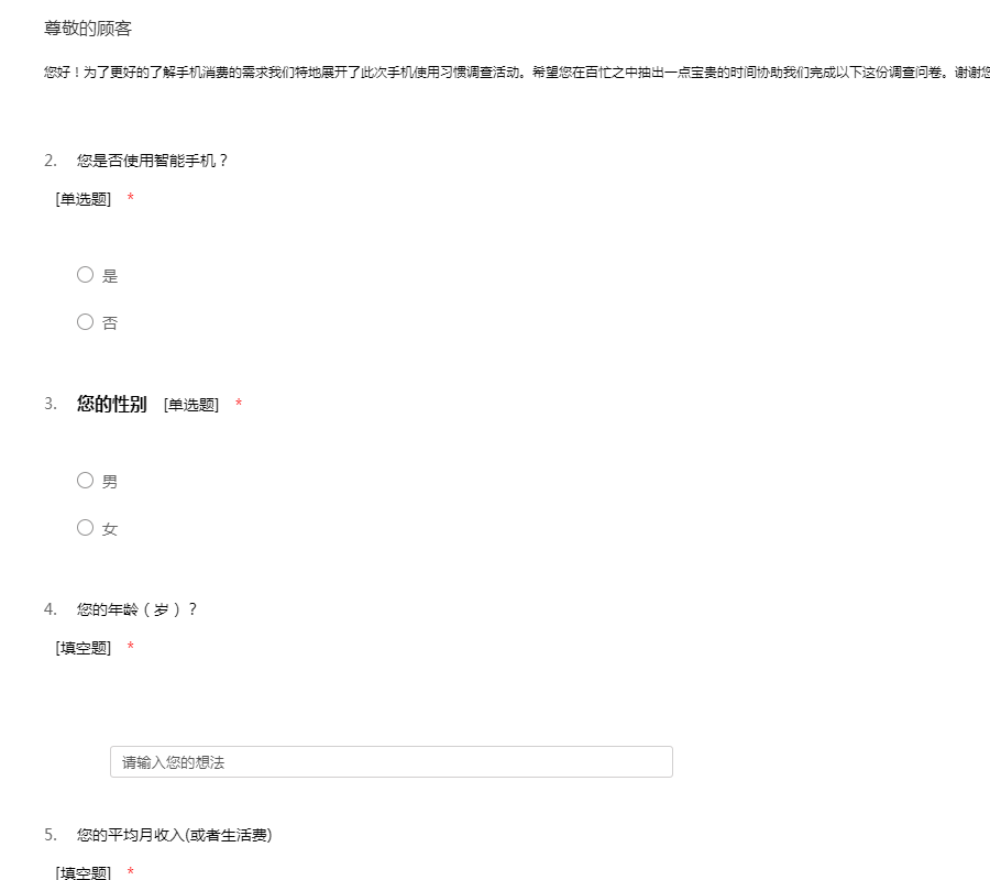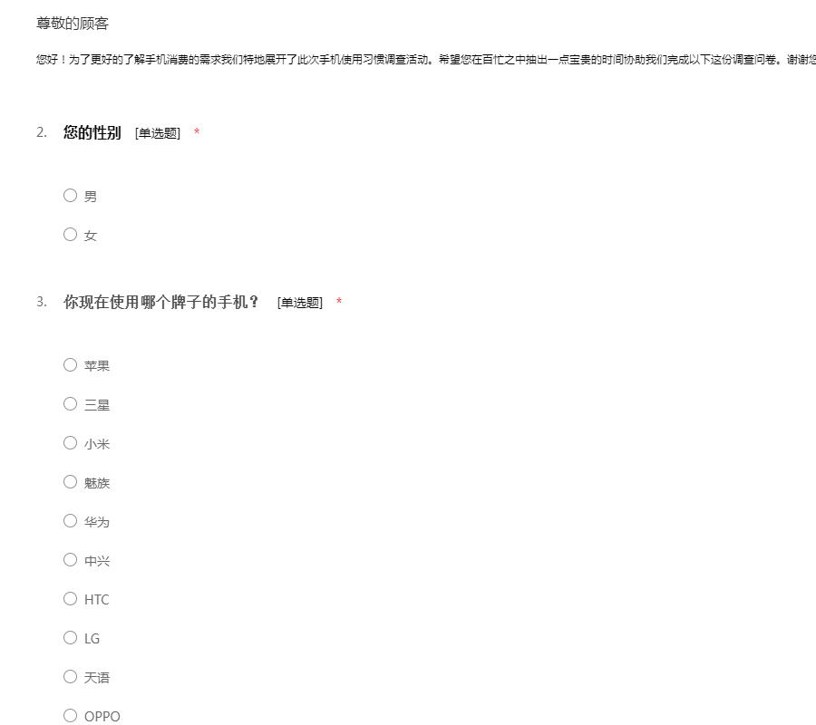 您好!为了更好的了解手机消费的需求我们特地展开了此次手机使用习惯调查活动。希望您在百忙之中抽出一点宝贵的时间协助我们完成以下这份调查问卷。谢谢您的合作!