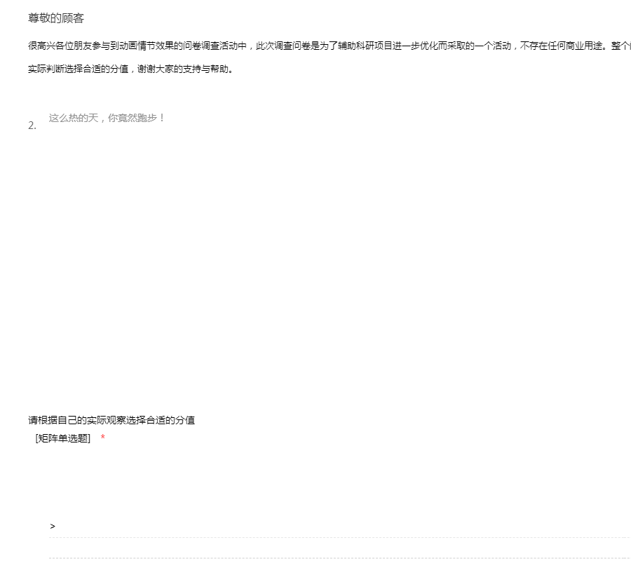 很高兴各位朋友参与到动画情节效果的问卷调查活动中,此次调查问卷是为了辅助科研项目进一步优化而采取的一个活动,不存在任何商业用途。整个问卷的按照5分制的形式进行,请根据自己的实际判断选择合适的分值,谢谢大家的支持与帮助。