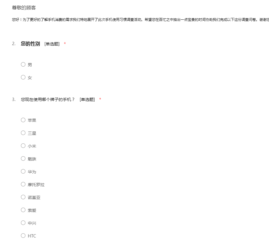 您好!为了更好的了解手机消费的需求我们特地展开了此次手机使用习惯调查活动。希望您在百忙之中抽出一点宝贵的时间协助我们完成以下这份调查问卷。谢谢您的合作!