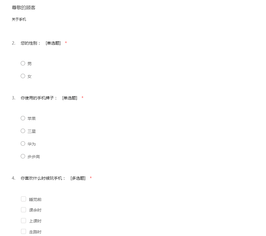 您好!为了更好的了解手机消费的需求我们特地展开了此次手机使用习惯调查活动。希望您在百忙之中抽出一点宝贵的时间协助我们完成以下这份调查问卷。谢谢您的合作!