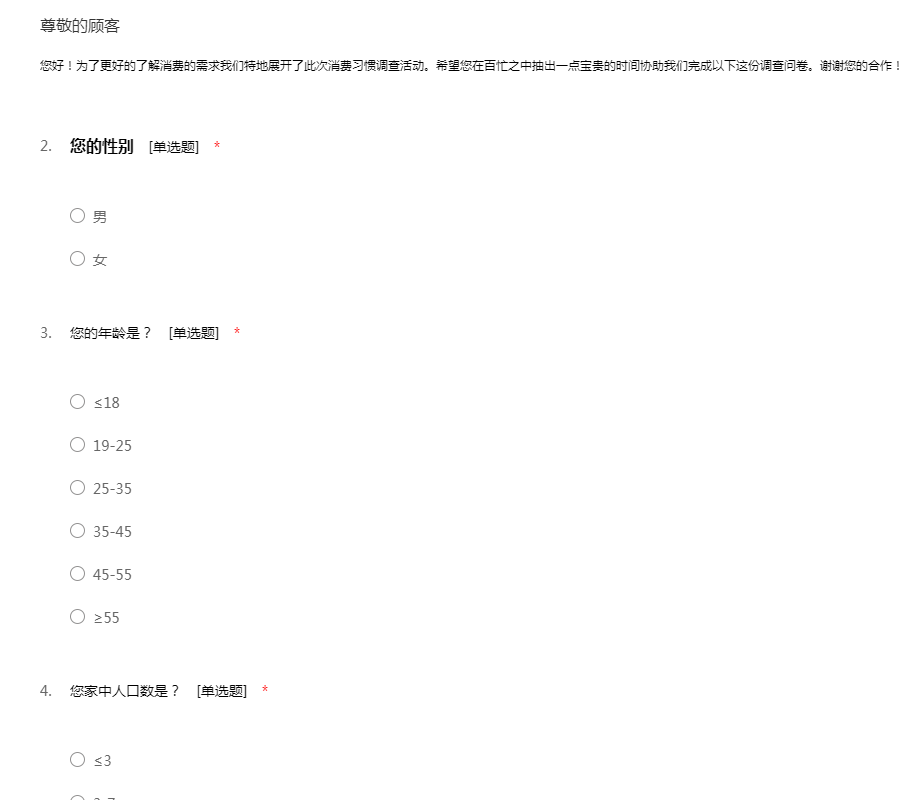 您好!为了更好的了解消费的需求我们特地展开了此次消费习惯调查活动。希望您在百忙之中抽出一点宝贵的时间协助我们完成以下这份调查问卷。谢谢您的合作!