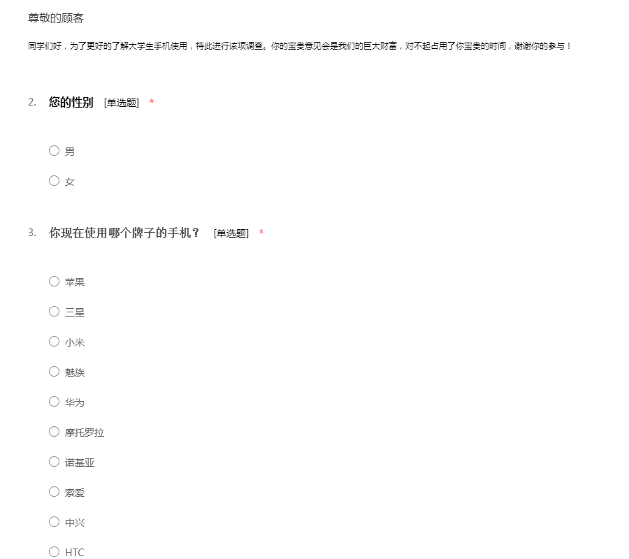 您好!为了更好的了解手机消费的需求我们特地展开了此次手机使用习惯调查活动。希望您在百忙之中抽出一点宝贵的时间协助我们完成以下这份调查问卷。谢谢您的合作!