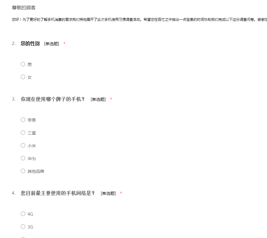 您好!为了更好的了解手机消费的需求我们特地展开了此次手机使用习惯调查活动。希望您在百忙之中抽出一点宝贵的时间协助我们完成以下这份调查问卷。谢谢您的合作!