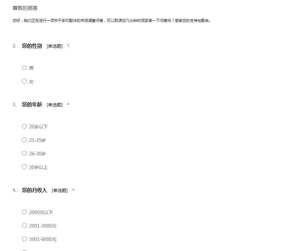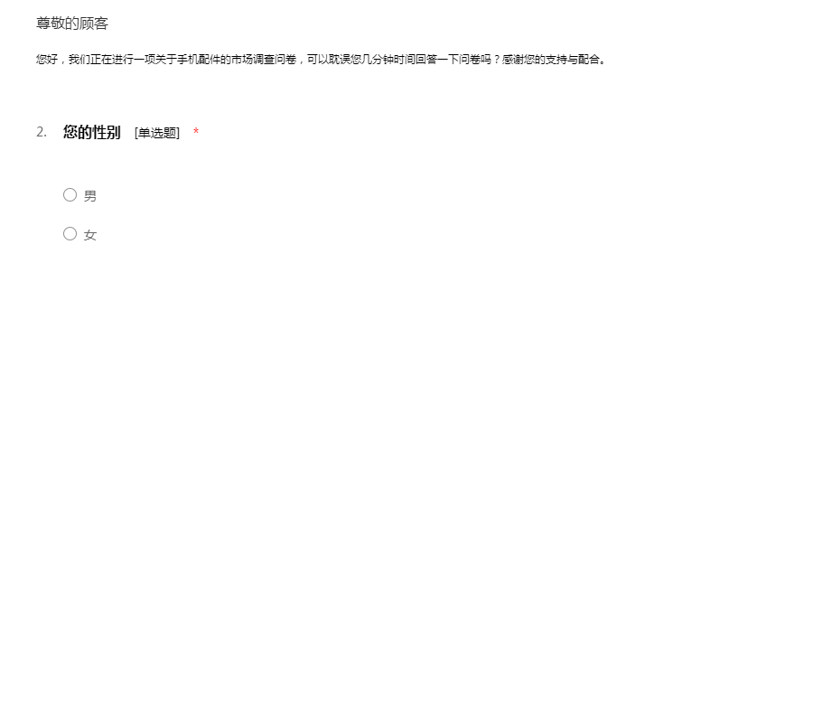 您好,我们正在进行一项关于手机配件的市场调查问卷,可以耽误您几分钟时间回答一下问卷吗?感谢您的支持与配合。