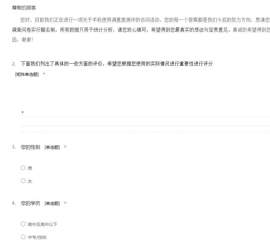 您好,目前我们正在进行一项关于手机使用满意度测评的访问活动,您的每一个答案都是我们今后的努力方向,恳请您用几分钟时间帮忙填答这份问卷。本调查问卷实行匿名制,所有数据只用于统计分析,请您放心填写,希望得到您最真实的想法与宝贵意见。真诚的希望得到您的配合与帮助,急切盼望您的回函,谢谢!