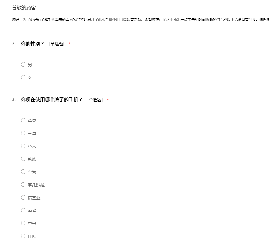 尊敬的女士/先生,您好!我们现在正在进行对于手机的市场调查,想要了解广大群众对手机的需求及偏好。问卷不记名,占用您一点时间帮助我们完成这份调查问卷。感谢您对我们的协助与支持!
