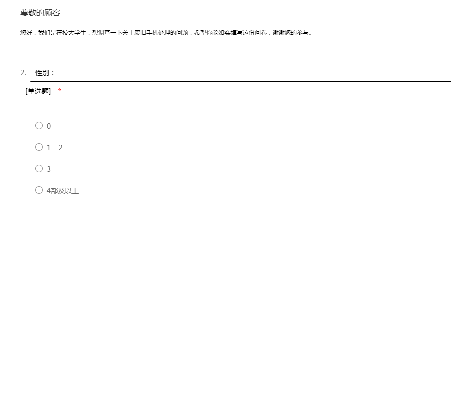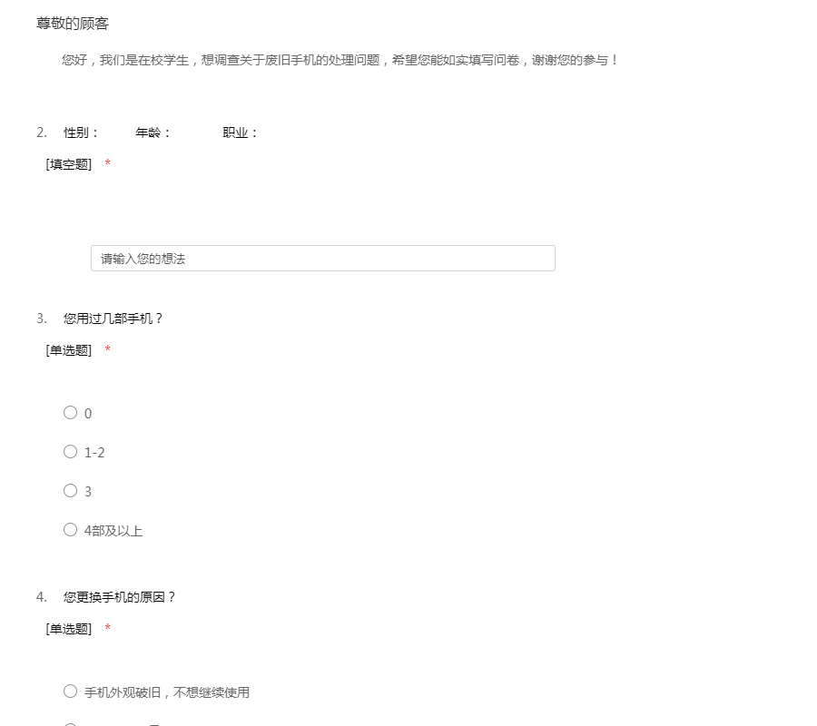您好,我们是在校大学生,想调查一下关于废旧手机处理的问题,希望你能如实填写这份问卷,谢谢您的参与。