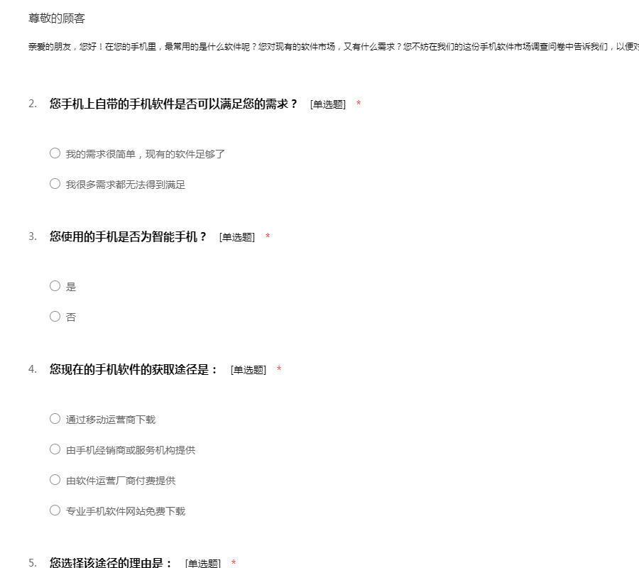 亲爱的朋友,您好!在您的手机里,最常用的是什么软件呢?您对现有的软件市场,又有什么需求?您不妨在我们的这份手机软件市场调查问卷中告诉我们,以便对手机软件市场进行调整。感谢您的大力支持!