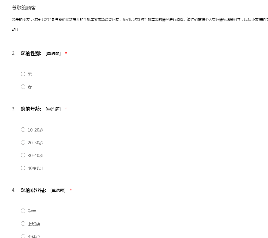 亲爱的朋友,你好!欢迎参与我们此次展开的手机美容市场调查问卷,我们此次针对手机美容的情况进行调查。请你们根据个人实际情况填答问卷,以保证数据的准确性。感谢您抽出宝贵时间参与我们此次的活动!