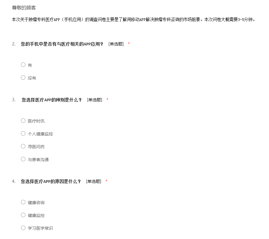本次关于肿瘤专科医疗APP(手机应用)的调查问卷主要是了解用移动APP解决肿瘤专科咨询的市场前景。本次问卷大概需要3-5分钟。