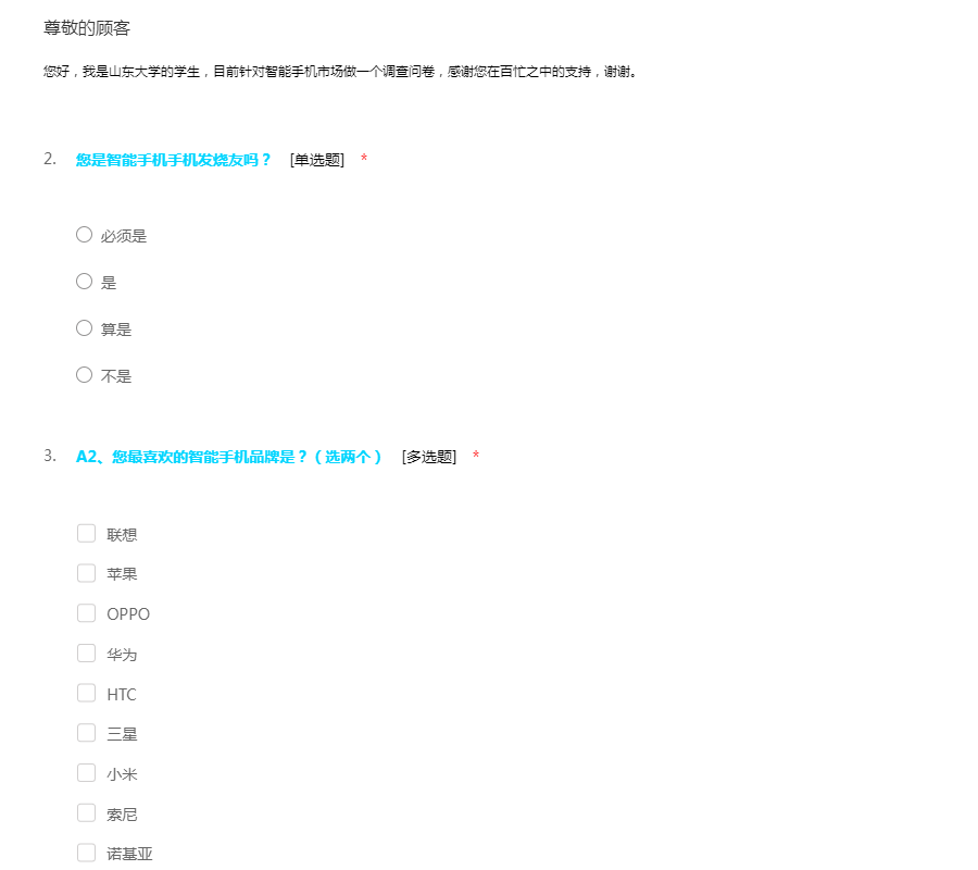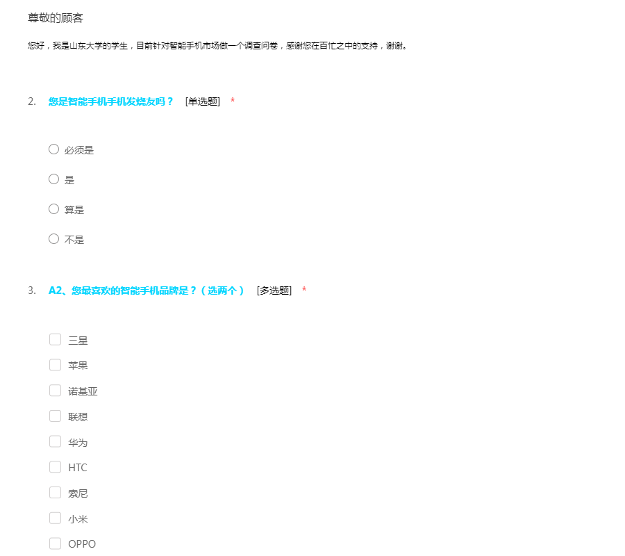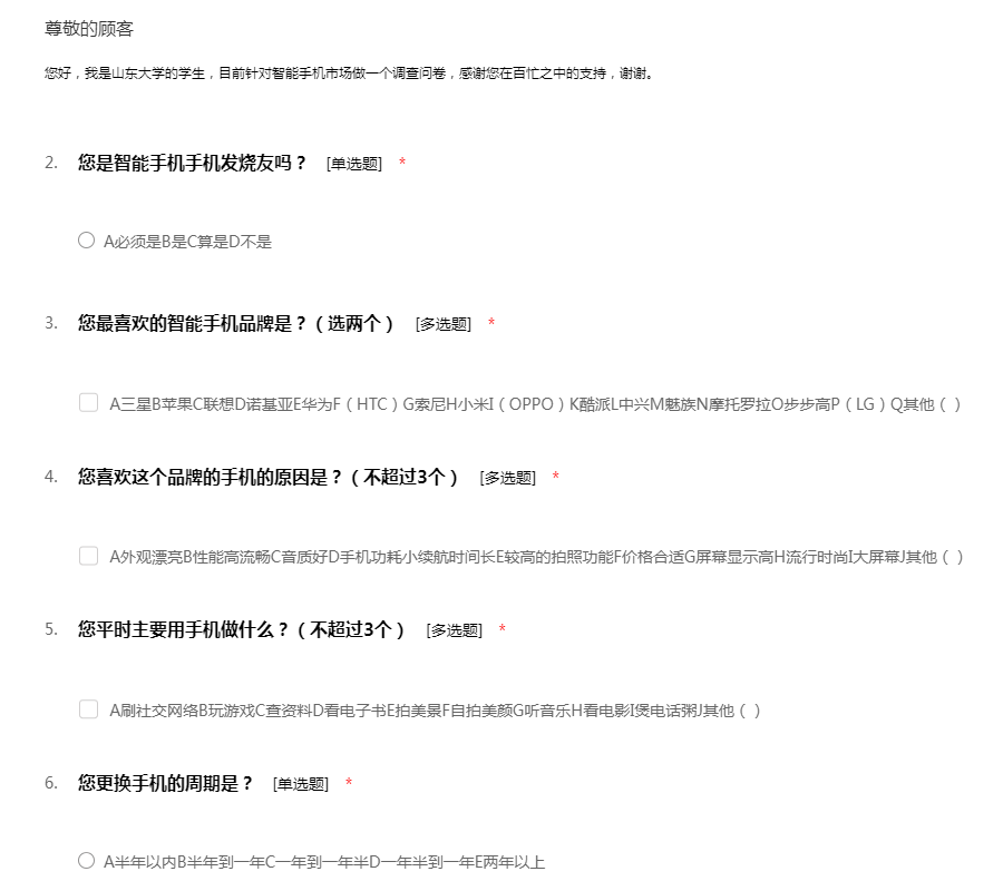 您好,我是山东大学的学生,目前针对智能手机市场做一个调查问卷,感谢您在百忙之中的支持,谢谢。