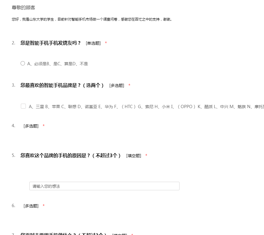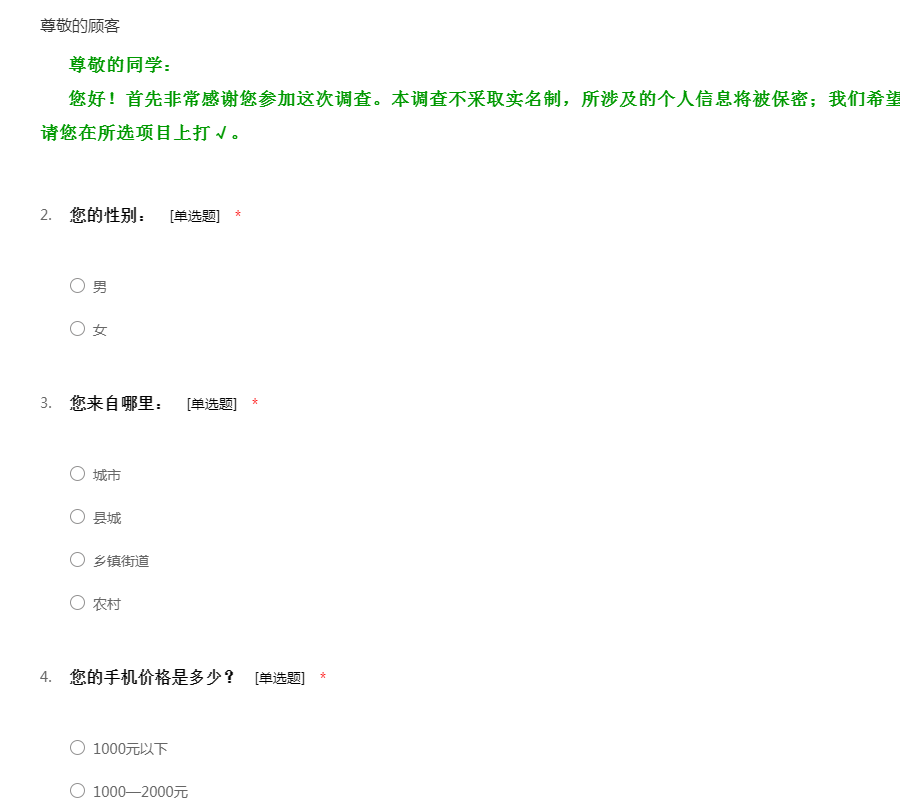 ——尊敬的客户,您好!我们正在进行一项关于手机的市场问卷调查,耽误您几分钟来填写我们的答卷。您的建议对我们的帮助很大。感谢您的支持!