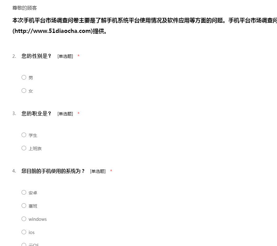 本次手机平台市场调查问卷主要是了解手机系统平台使用情况及软件应用等方面的问题。手机平台市场调查问卷模板是由我要调查网(http://www.51diaocha.com)提供。