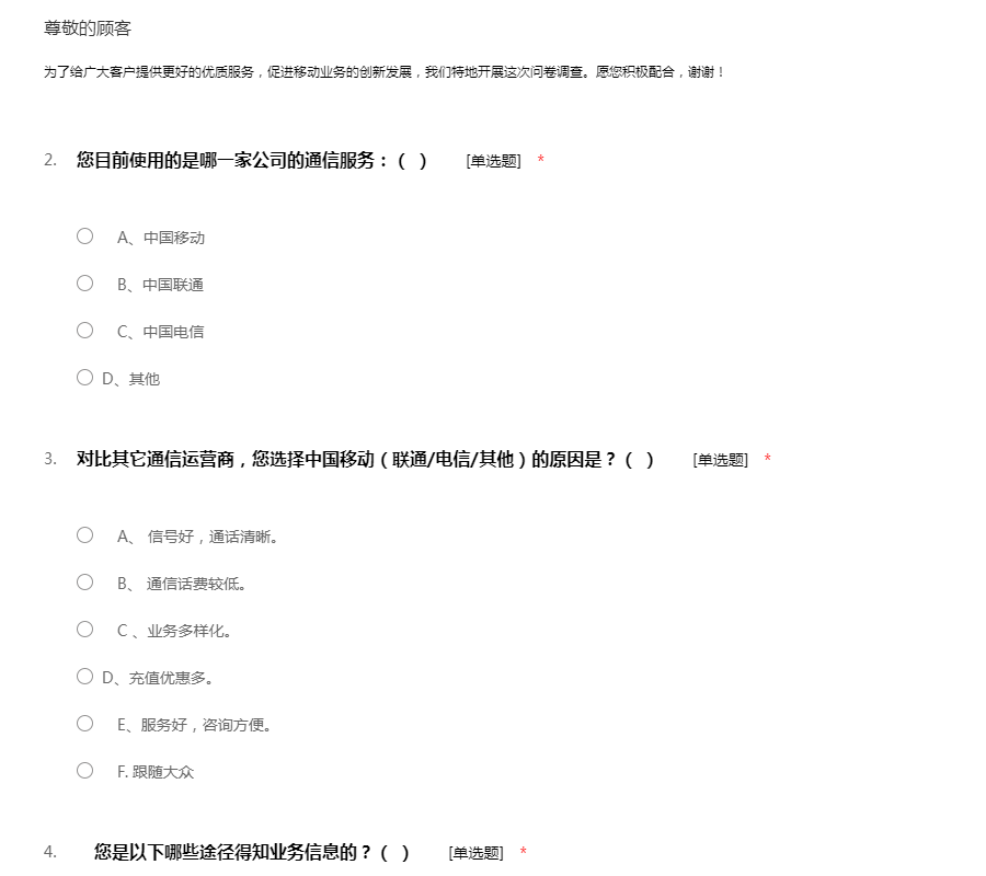 为了给广大客户提供更好的优质服务,促进移动业务的创新发展,我们特地开展这次问卷调查。愿您积极配合,谢谢!