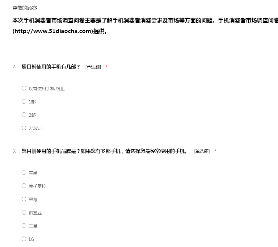 感谢您参与“三星手机市场调查问卷”,本次调查旨在了解消费者购买三星手机的市场份额,调查所得的结果对您的工作和生活不会带来任何不良影响,请您根据自己的实际情况放心填写,51调查网感谢您的配合!