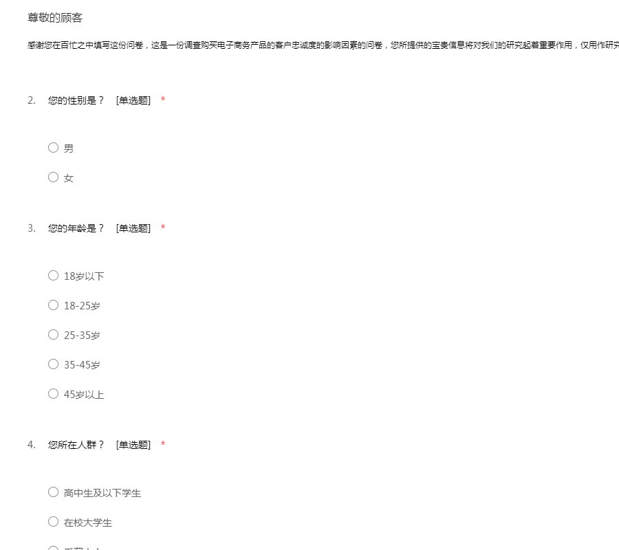 感谢您在百忙之中填写这份问卷,这是一份调查购买电子商务产品的客户忠诚度的影响因素的问卷,您所提供的宝贵信息将对我们的研究起着重要作用,仅用作研究,请放心填写,谢谢!