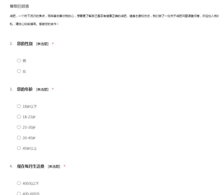 减肥,一个时下流行的焦点,同样牵动着你我的心,想要更了解自己是否有健康正确的减肥、健身态度和方式,我们做了一份关于减肥问题调查问卷,欢迎加入我们!减肥问题调查问卷,我们将严格维护您的隐私,请放心如实填写。感谢您的合作!