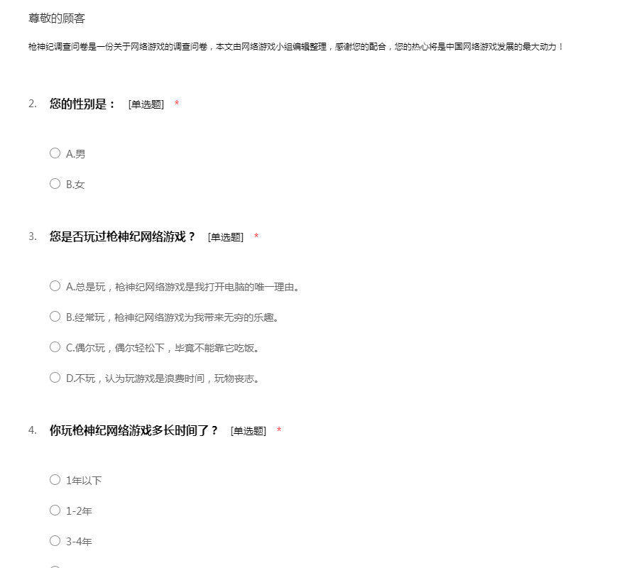 枪神纪调查问卷是一份关于网络游戏的调查问卷,本文由网络游戏小组编辑整理,感谢您的配合,您的热心将是中国网络游戏发展的最大动力!