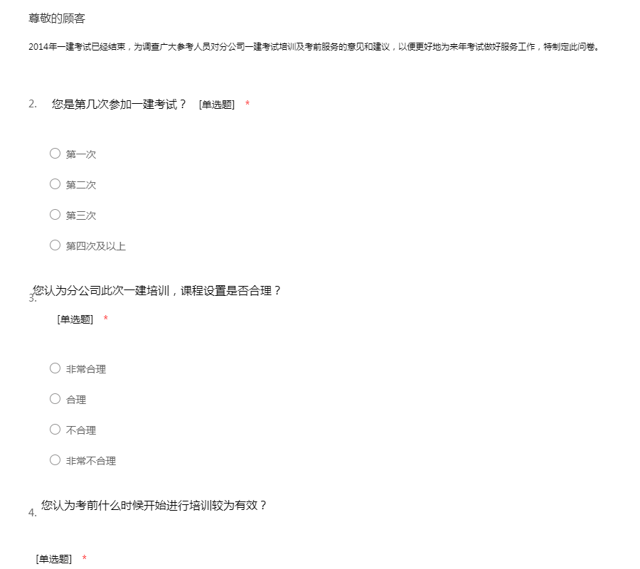 2014年一建考试已经结束,为调查广大参考人员对分公司一建考试培训及考前服务的意见和建议,以便更好地为来年考试做好服务工作,特制定此问卷。