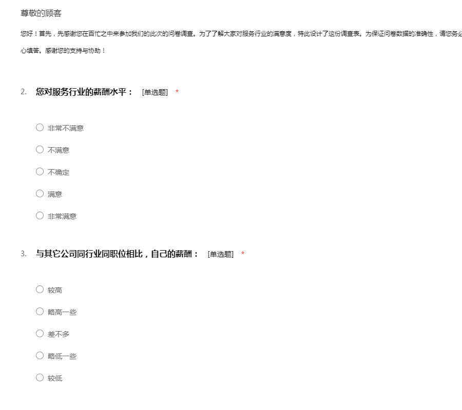 您好!首先,先感谢您在百忙之中来参加我们的此次的问卷调查。为了了解大家对服务行业的满意度,特此设计了这份调查表。为保证问卷数据的准确性,请您务必要根据实际情况来填写。问卷不记名,所以请放心填答。感谢您的支持与协助!