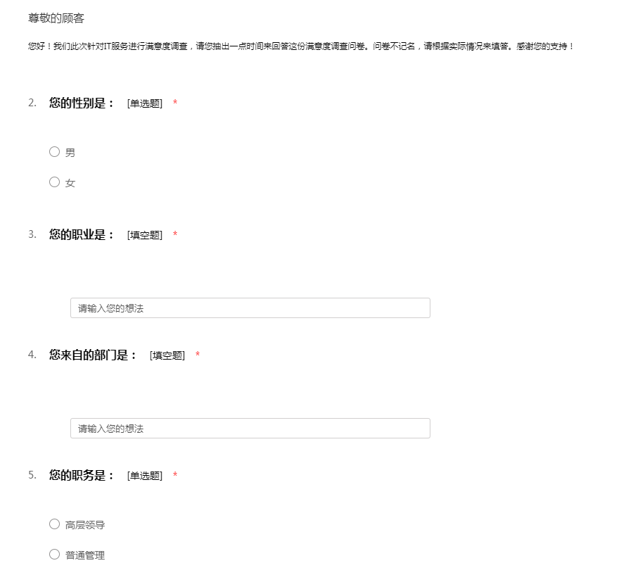 您好!我们此次针对IT服务进行满意度调查,请您抽出一点时间来回答这份满意度调查问卷。问卷不记名,请根据实际情况来填答。感谢您的支持!