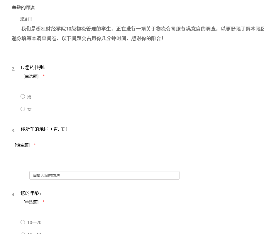 您好! 我们是浙江财经学院10级物流管理的学生,正在进行一项关于物流公司服务满意度的调查,以更好地了解本地区目前物流快递服务现况,因此特邀你填写本调查问卷,以下问题会占用你几分钟时间,感谢你的配合!