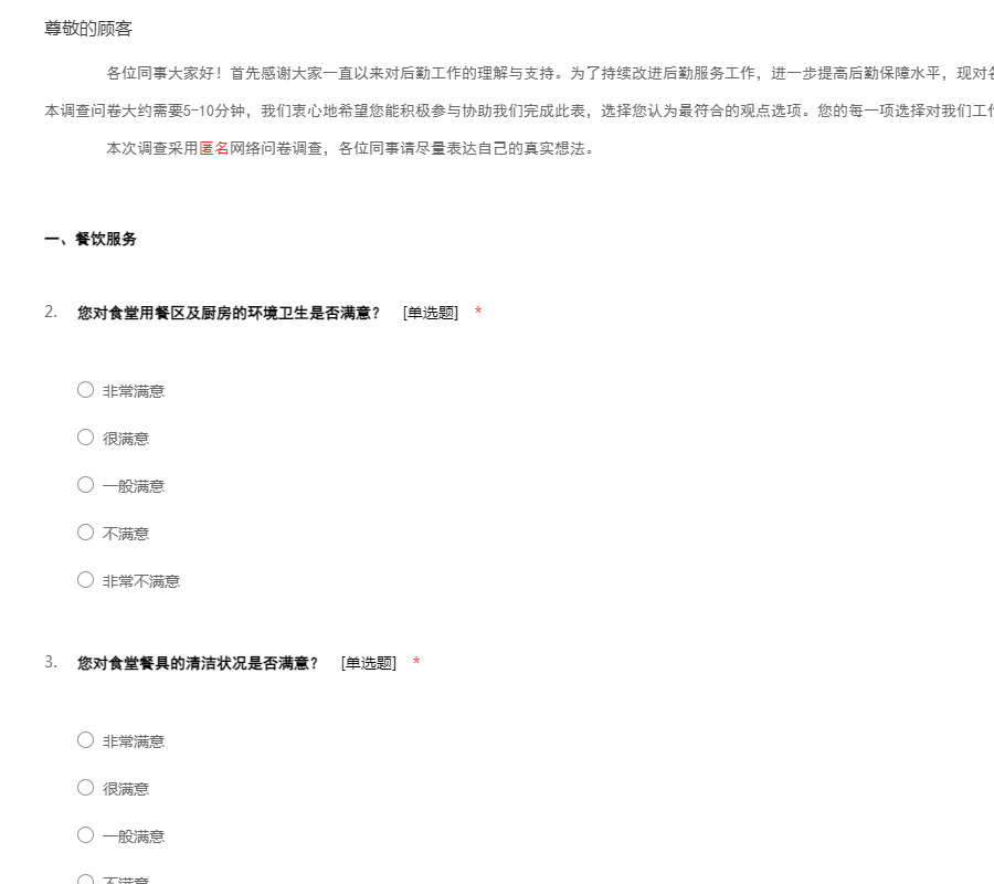各位同事大家好!首先感谢大家一直以来对后勤工作的理解与支持。为了持续改进后勤服务工作,进一步提高后勤保障水平,现对各后勤服务项目进行满意度调查。您完成本调查问卷大约需要5-10分钟,我们衷心地希望您能积极参与协助我们完成此表,选择您认为最符合的观点选项。您的每一项选择对我们工作的改进都十分重要。 本次调查采用匿名网络问卷调查,各位同事请尽量表达自己的真实想法。