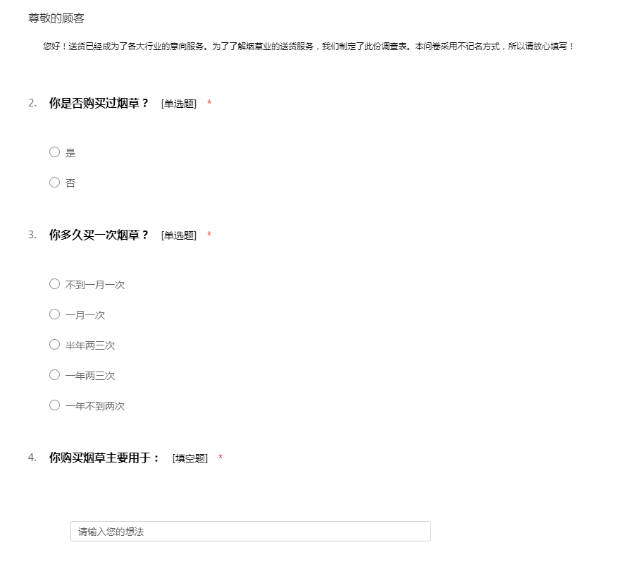 您好!送货已经成为了各大行业的意向服务。为了了解烟草业的送货服务,我们制定了此份调查表。本问卷采用不记名方式,所以请放心填写!