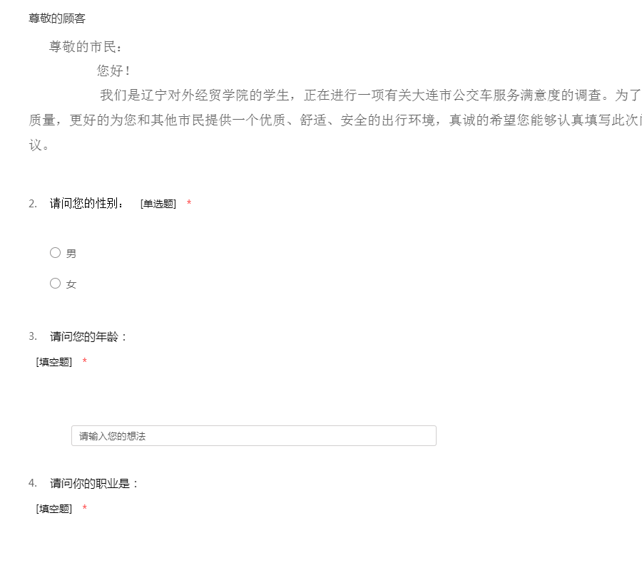 尊敬的市民: 您好! 我们是辽宁对外经贸学院的学生,正在进行一项有关大连市公交车服务满意度的调查。为了进一步提升大连市公交的服务质量,更好的为您和其他市民提供一个优质、舒适、安全的出行环境,真诚的希望您能够认真填写此次问卷,提出您宝贵的意见和建议。