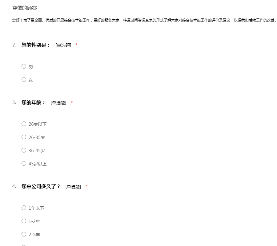 您好!为了更全面、优质的开展综合技术组工作,更好的服务大家,特通过问卷调查表的形式了解大家对综合技术组工作的评价及建议,以便我们后续工作的改善。感谢您的参与!