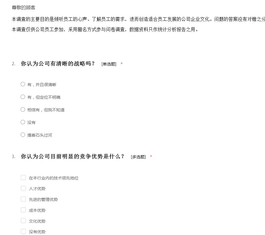 本调查的主要目的是倾听员工的心声、了解员工的需求,进而创造适合员工发展的公司企业文化。问题的答案没有对错之分,重要的是听取你的意见和看法。本调查仅供公司员工参加,采用匿名方式参与问卷调查,数据资料只作统计分析报告之用。