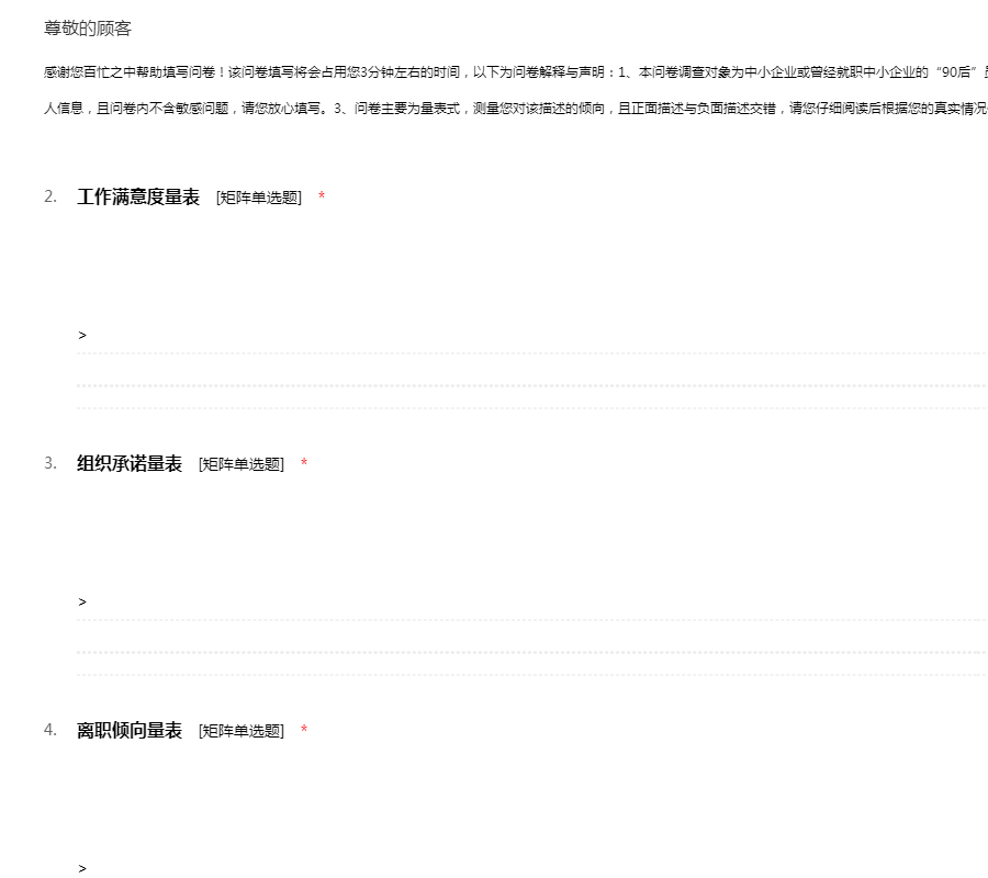 感谢您百忙之中帮助填写问卷!该问卷填写将会占用您3分钟左右的时间,以下为问卷解释与声明:1、本问卷调查对象为中小企业或曾经就职中小企业的“90后”员工。2、问卷为学术研究使用,不会泄露您的私人信息,且问卷内不含敏感问题,请您放心填写。3、问卷主要为量表式,测量您对该描述的倾向,且正面描述与负面描述交错,请您仔细阅读后根据您的真实情况作答。谢谢您的配合,衷心祝您工作愉快!